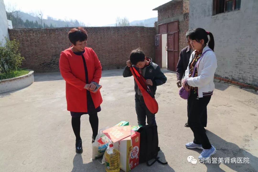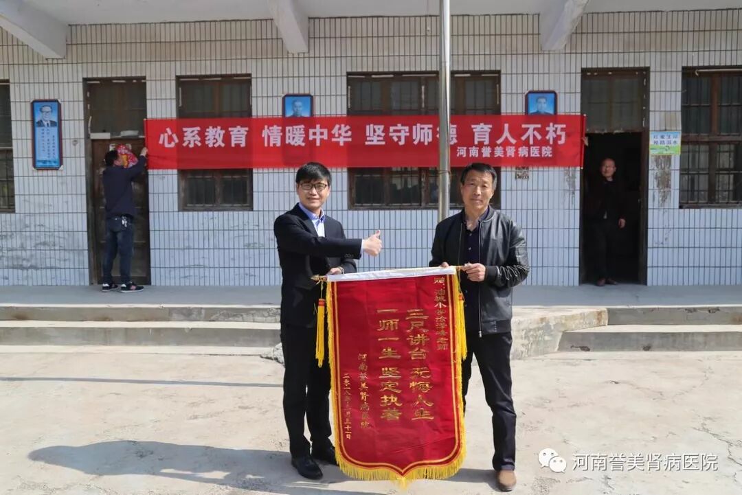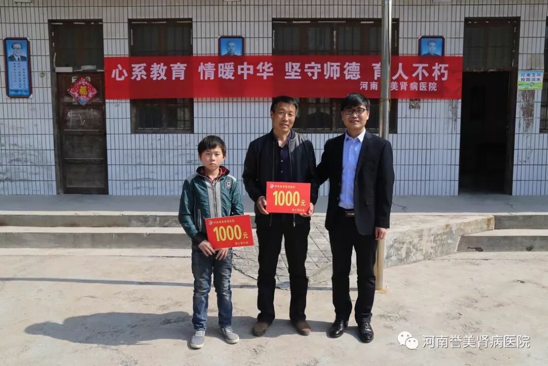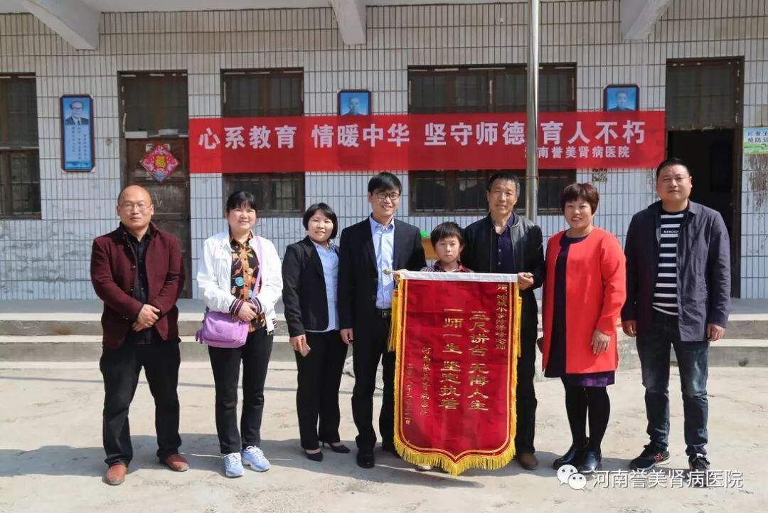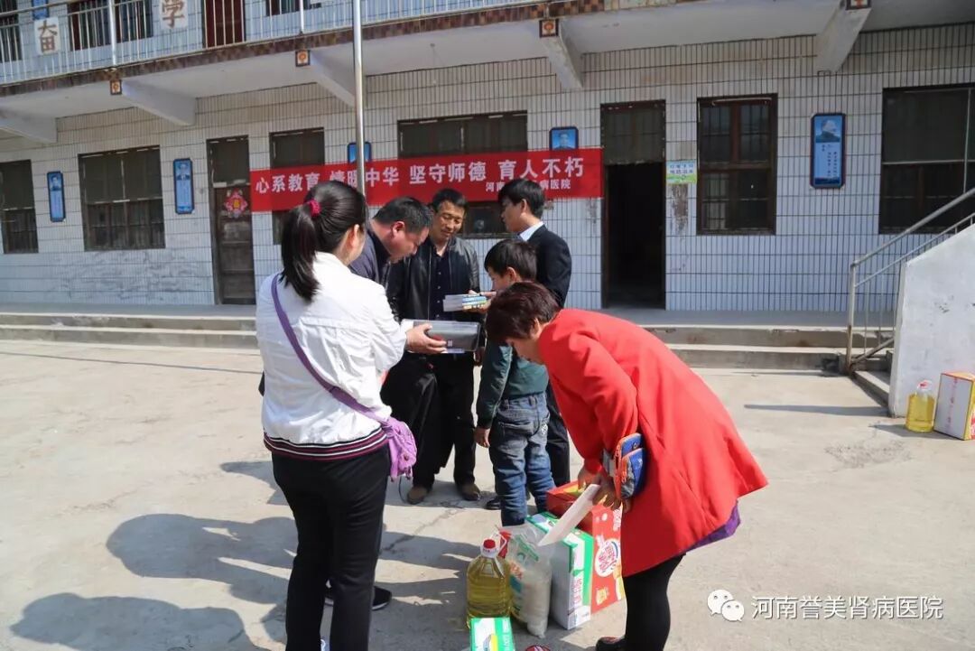 3月31日上午,河南誉美肾病医院一行人在院长李志强的带领下前往淇县油城小学,看望徐泽峰老师和徐佳淇同学。为徐泽峰老师送去锦旗、图书和1000元健康慰问基金,为徐佳淇同学送去书包等学习用品、体育用品。